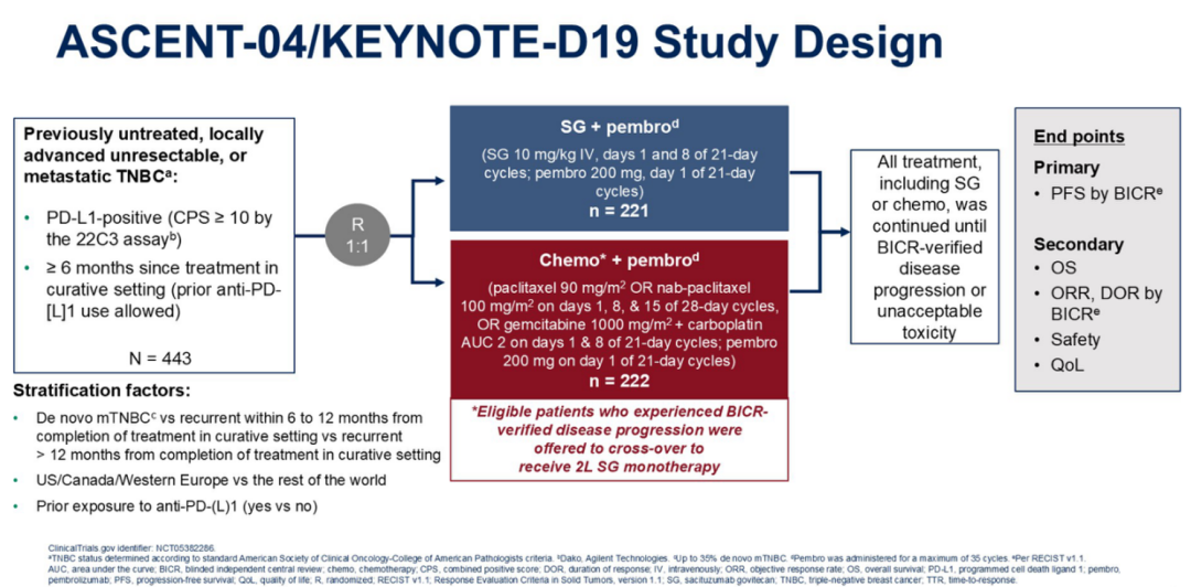 [1]、Sara M.Tolaney,et al.Sacituzumab govitecan(SG)+pembrolizumab(pembro)vs chemotherapy(chemo)+pembro in previously untreated PD-L1–positive advanced triple-negative breast cancer(TNBC):Primary results from the randomized phase 3 ASCENT-04/KEYNOTE-D19 study.2025 ASCO LBA 109