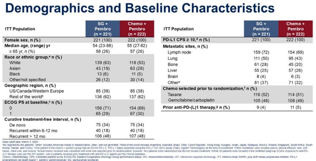 该研究最终共纳入了443例患者,其中221例接受SG+帕博利珠单抗治疗,222例接受化疗+帕博利珠单抗治疗,患者基线特征如下(图2)。