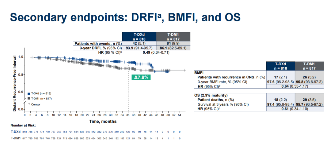 此外,关键次要终点3年DFS率提升8.8%(92.3%vs 83.5%;HR=0.47;95%CI:0.34-0.66;P<0.0001),3年DRFI率显著提升7.8%(93.9%vs 86.1%,HR=0.49),在降低脑转移发生风险方面,T-DXd组也呈现优势(3年BMFI:97.6%vs 95.8%HR=0.64)。虽然目前OS数据成熟度为2.9%,但从KM曲线上已经能看出T-DXd的获益趋势(HR=0.61)。