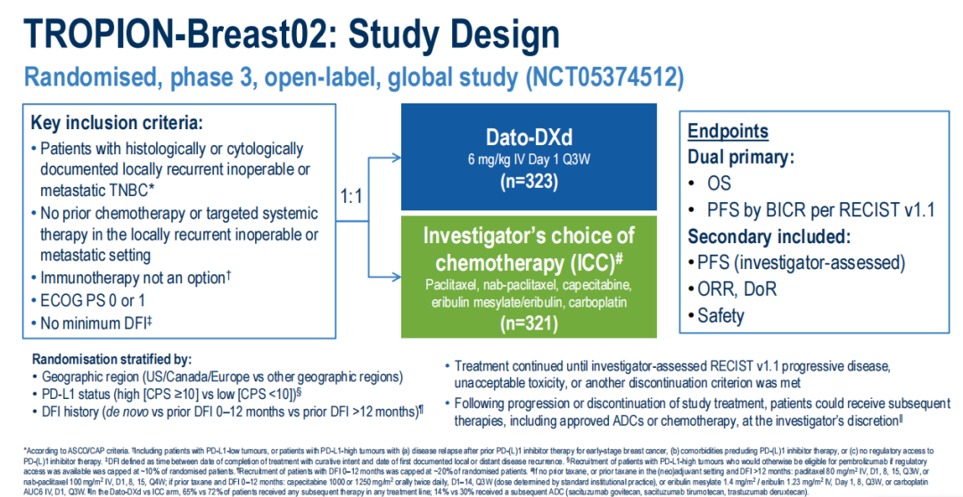 在ESMO 2025年会上,Dato-DXd在mTNBC患者的治疗中的Ⅲ期研究——TB-02研究[1]结果的公布,为mTNBC一线免疫不适用患者带来了新的治疗希望。该研究是一项全球、随机、多中心、开放性的Ⅲ期临床试验,旨在评估Dato-DXd与研究者选择的化疗方案(紫杉醇、白蛋白紫杉醇、卡培他滨、卡铂或艾立布林)在治疗不适合接受PD-1/PD-L1抑制剂治疗的既往未经治的局部复发无法手术或转移性TNBC患者中的疗效和安全性。研究纳入的人群包括脑转移、肝转移等患者且不限制患者既往的无病间期(DFI)时间,更贴近临床实际情况,按地区、PD-L1状态和既往无病间期时间对入组患者进行分层。此外,研究采用双主要终点,分别为根据盲态独立中心阅片(BICR)评估的无进展生存期(PFS)及总生存期(OS)。关键次要终点包括研究者评估的PFS、客观缓解率(ORR)、缓解持续时间(DoR)、疾病控制率(DCR)、药代动力学(PK)及安全性。