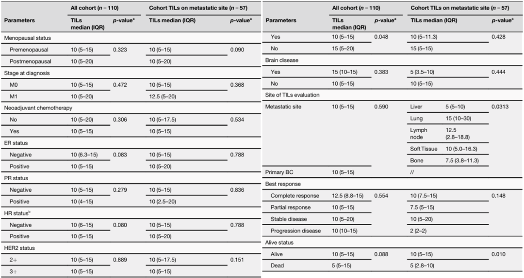 这项多中心回顾性研究纳入了2013年6月至2024年5月期间在欧洲肿瘤研究所和AOU Umberto I综合诊所接受治疗的110例HER2+mBC患者。采用苏木精-伊红染色切片对转移性乳腺癌(n=57)或原发性乳腺癌(n=53)样本的TIL水平进行评估。仅对一小部分患者(n=13)同时评估原发性肿瘤和转移性乳腺癌部位的TIL水平。