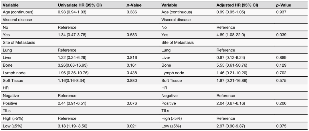 研究者检验了TIL水平与PFS之间的相关性,并校正了年龄、累及内脏、HR状态和TIL评估部位等临床变量。单变量分析显示,TIL水平较低与PFS较差相关(HR=1.74,P=0.024)。校正上述临床变量后,这种关联仍然显著(HR=1.77,P=0.024)。当将TIL视为连续变量(每10%增量)时,TIL水平较高与更好的预后相关,但统计学上并不显著。