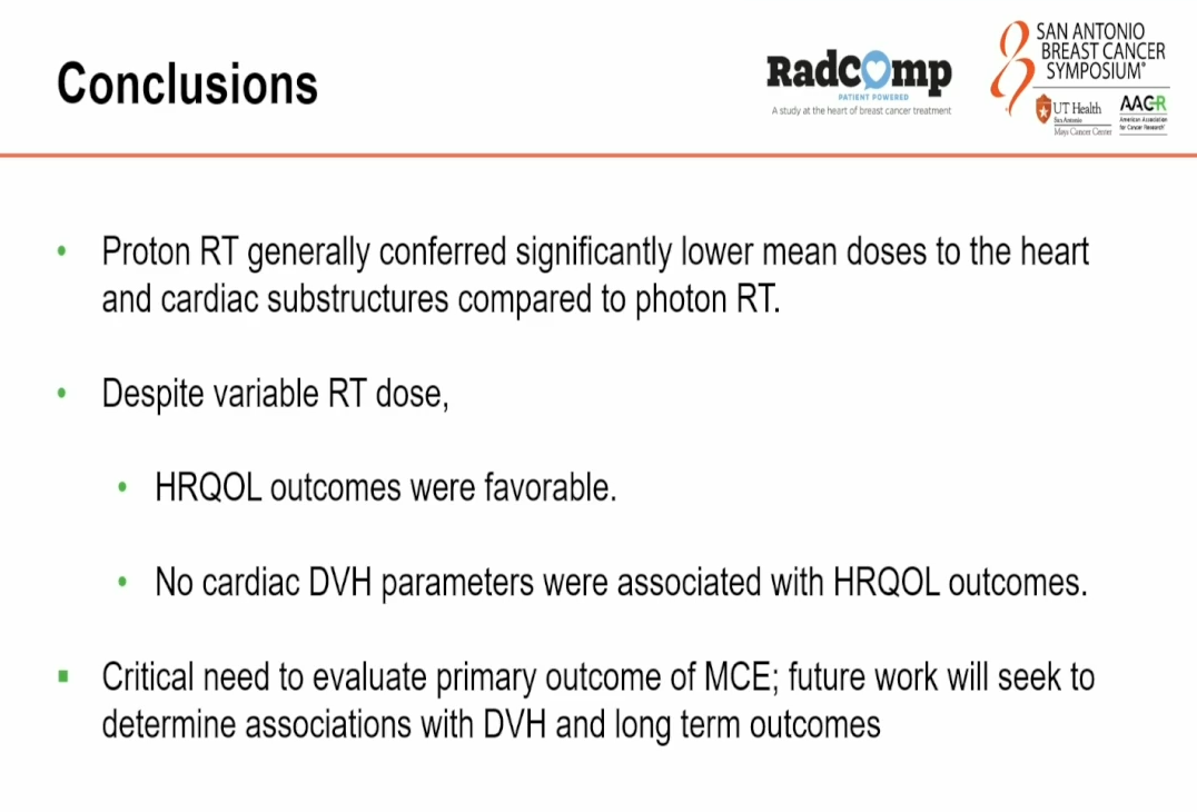 第48届圣安东尼奥乳腺癌研讨会(SABCS 2025)于12月9日至12日在美国得克萨斯州圣安东尼奥召开。作为全球乳腺癌研究领域的顶级学术盛会,SABCS不仅展示了该领域的最新科研成果,更肩负着促进临床实践创新与科研突破的重要使命。在本届大会上,备受瞩目的RadComp研究公布了其关于质子治疗与光子治疗在乳腺癌患者中心脏剂量体积参数与心脏特异性健康相关生活质量(HRQOL)之间相关性分析的结果(摘要号:RF6-04),揭示了质子治疗在降低心脏辐射剂量方面的显著优势,及其对患者短期心脏健康相关生活质量的影响。肿瘤瞭望特邀上海交通大学医学院附属瑞金医院陈佳艺教授对此项研究进行点评。