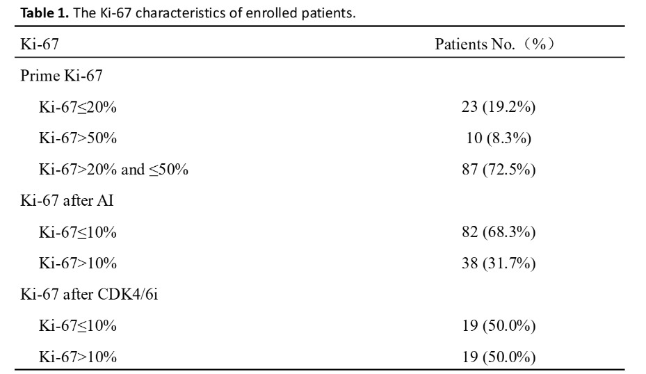 2023年2月至2025年期间,共招募了120例患者。经2周AI治疗后,68.3%(82/120)的患者达到Ki-67≤10%(对AI治疗有反应),而31.7%(38/120)的患者仍为Ki-67>10%(对AI治疗无反应)。在AI治疗无反应的患者中,50.0%(19/38)的患者在接受一个周期的AI联合CDK4/6i治疗后仍为Ki-67>10%(对CDK4/6i治疗无反应),其余50.0%的患者达到Ki-67≤10%(对CDK4/6i治疗有反应)。未观察到新的药物相关不良事件。
