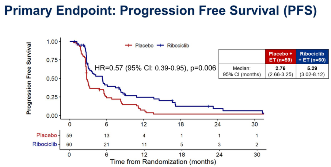 In the study,the primary endpoint was progression free survival.We saw that MAINTAIN was a positive study for the patients who were randomized ribociclib plus endocrine therapy.They had a statistically significant improvement in progression free survival compared to those who received placebo plus endocrine therapy.The hazard ratio was less than 0.6 and the P value of 0.006.I think these data confirm the hypothesis that there is benefit for CDK4/6 inhibitor after CDK4/6 inhibitor.