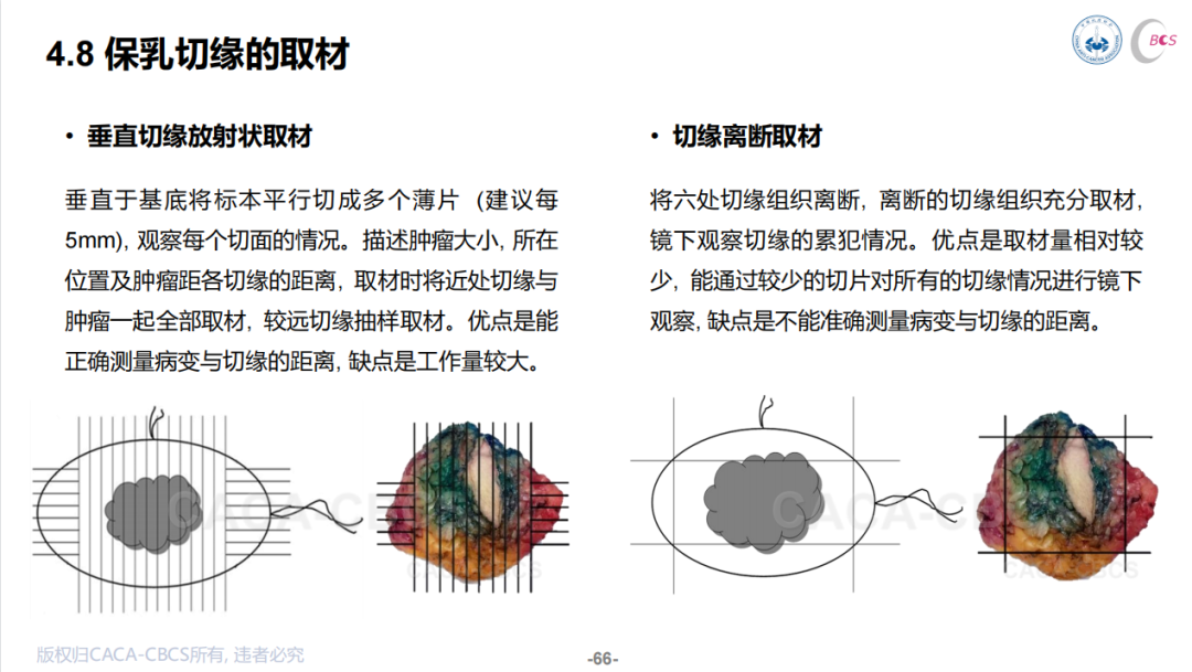 取材方式一般有两种,一种是国外用得比较多的“垂直切缘放射状取材”,这种方法需要平行切成多个层面,可以反映每个层面的肿瘤切缘距离,但工作量较大。对于强调“no ink on tumor”原则的浸润性癌,这种取材方法的优势就不那么突出了,可能更适合于仍推荐2mm安全切缘的原位导管癌(DCIS)。另一种取材方法是“切缘离断取材”,也是国内比较常用的方法,其优点是取材工作量少而面积大,也有足够的标本进行术中冰冻检查。